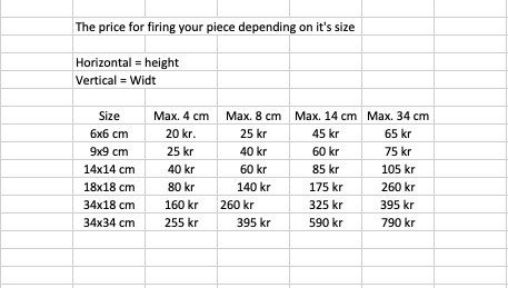 *note there will be an additional charge for the firing of your finished pieces depending on size (please see prize chart in pictures)